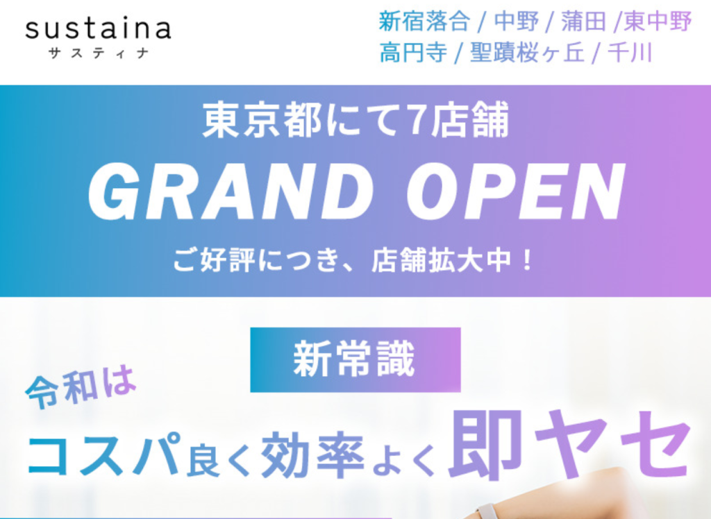 | サスティナパーソナルジム | サブスク制 | 完全個室マンツーマン | 毎食写真報告 | 駅近・完全個室・科学的指導 |